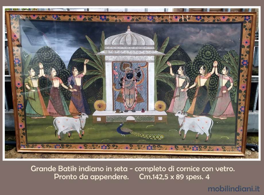 L'immagine raffigura Shrinathji, una forma del Dio Krishna, all'interno di un santuario. Il tempio principale di Shrinathji si trova a Nathdwara, in Rajasthan, India. La divinità è raffigurata con la mano sinistra alzata a simboleggiare il sollevamento del monte Govardhan e la mano destra è poggiata sul fianco. L'immagine di Shrinathji è realizzata da un'unica lastra di marmo nero e si ritiene che si sia manifestata da sola. Ai lati del santuario, sono presenti della figure femminili; Le Gopi, tre per lato, in posa di adorazione. Il nome "Gopi" ha origini sanscrite, significa letteralmente "pastore di mucche" o "compagna di giochi di Krishna" Mis. cm.142,5 h.89 spess.4 Pronto da appendere. SOLO RITIRO PRESSO NS. SEDE COSTO ZERO. Info su WhatsApp o mail: info@mobilindiani.it