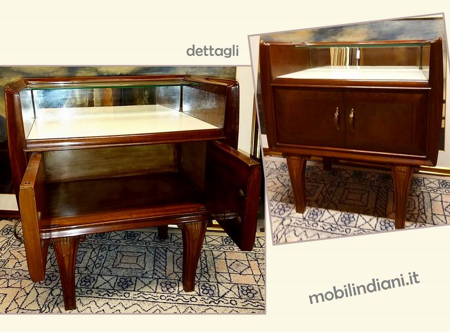 Disponibilità 1Comodino anni '50 originale. Design italiano. Realizzato in radica di noce. gambe intagliate in noce massello. Maniglie in ottone, piano in vetro color panna + piano rialzato (più piccolo) in vetro trasparente + specchio tra i due piani (vedi foto) Struttura sana e robusta, vetri in ottime condizioni. Sullo specchio sono presenti leggeri segni del tempo. Cm. 60x38 h.68 NO SPEDIZIONE - RITIRO PRESSO NS. SEDE COSTO ZERO. Per info chiedi su WhatsApp o mail: info@mobilindiani.it