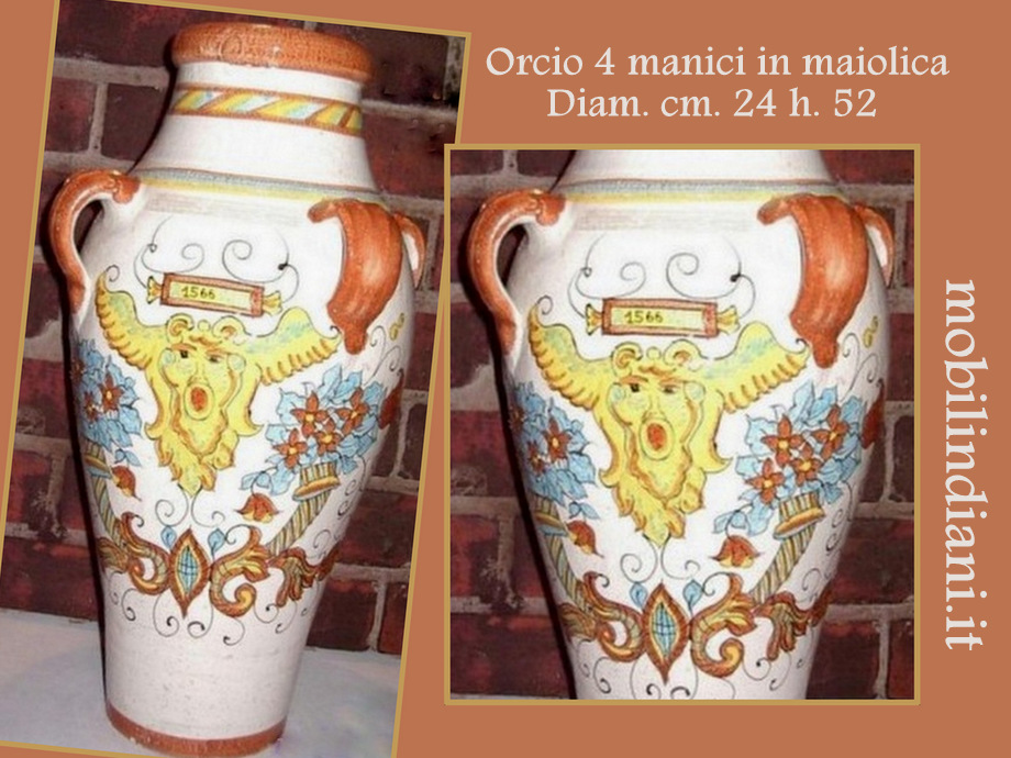 Disponibilità 1Orcio 4 manici in maiolica dipinta a mano con decoro antico. Diam. cm.24 h.52 Paese Deruta RITIRO PRESSO NS. SEDE COSTO ZERO - Per info chiedi su WhatsApp o mail: info@mobilindiani.it