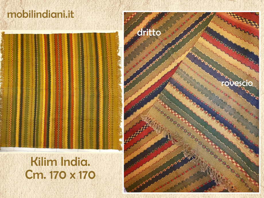 Disponibilità 1Tappeto Kilim doubleface. Stock fuori tutto. Cm.170x170 Paese Rajasthan, India STOCK FINO ESAURIMENTO COSTO TRASPORTO €. 19,95 Iva Inclusa. Per costi trasporto Isole, chiedi info su WhatsApp o mail: info@mobilindiani.it