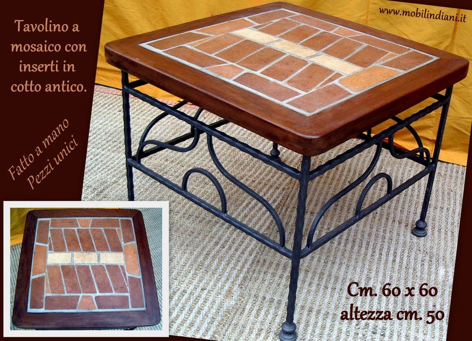 Disponibilità 1Tavolino fatto a mano. Cm.60x60 h.50 Basamento in ferro battuto, legno di faggio con lavorazione e mosaico realizzata con antichi mattoni in cotto. Paese Italia RITIRO PRESSO NS. SEDE COSTO ZERO - Per info chiedi su WhatsApp o mail: info@mobilindiani.it