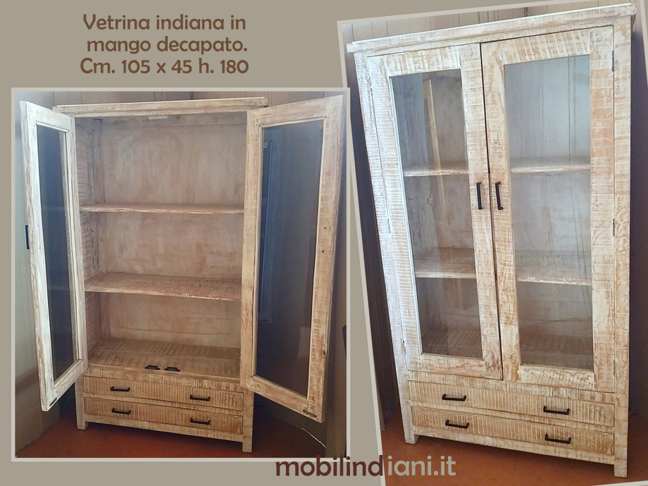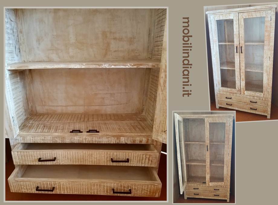 Disponibilità 1Vetrina indiana in legno di mango finitura decapata, realizzata artigianalmente 2 ante a vetro + 2 cassetti, maniglie in ferro. Cm.45x82 h.180 Paese di provenienza Rajasthan, India PER INFO COSTI SPEDIZIONE CHIEDI su WhatsApp o via mail: info@mobilindiani.it